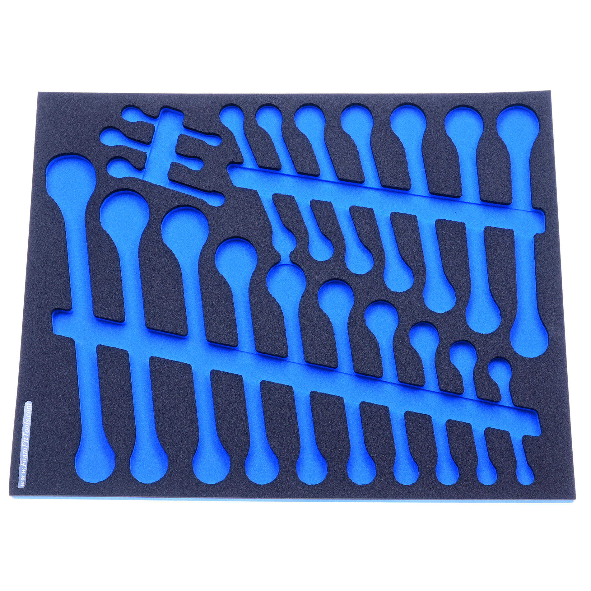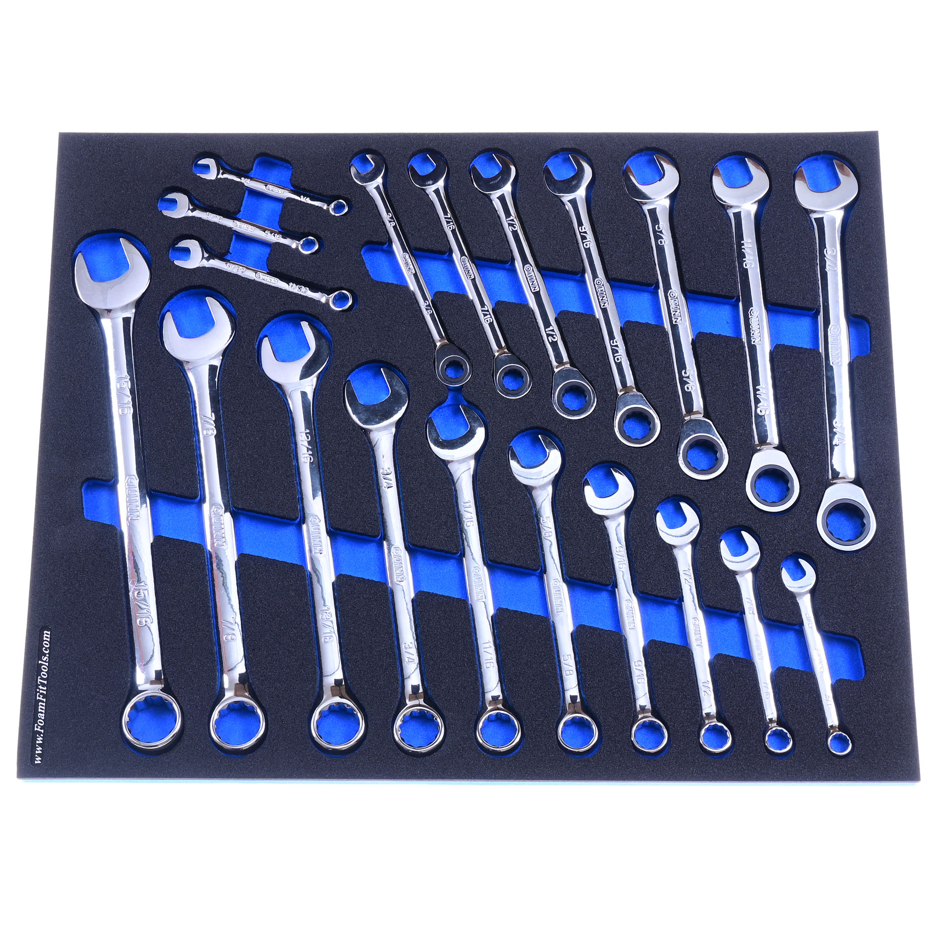 This tool organizer was designed to fit the inch wrenches from the Quinn 428-pc set 58154. The foam is sized to fit drawers in the Yukon 46-inch roll cab.