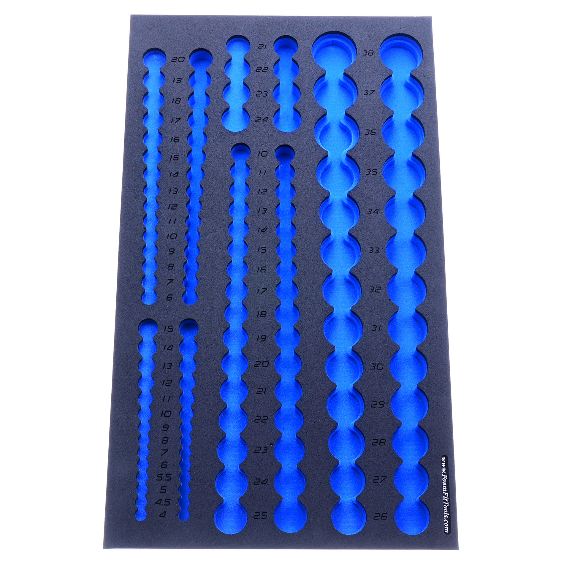 This tool organizer was designed to fit the metric sockets from the 214-pc Tekton set SHD99202. Sizes are permanently laser-marked between the rows. F-06170-T and F-06171-T are space-saving designs that are intended to be used together in a Tekton rolling cabinet drawer. Both organizers fit in a wider drawer with a gap between them for other tools. Measure your box before ordering because older Tekton boxes had less depth. The short and deep sockets are slightly different, so the deep sockets should be placed to the right. Impact sockets are larger and will not fit.