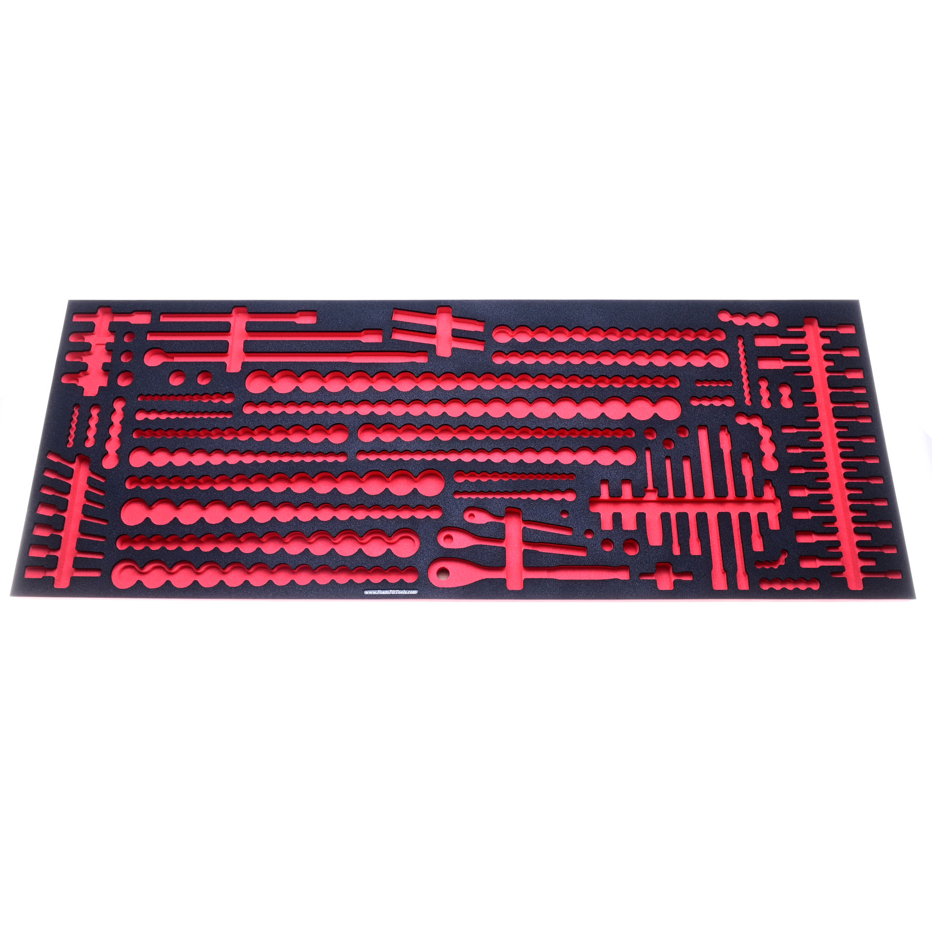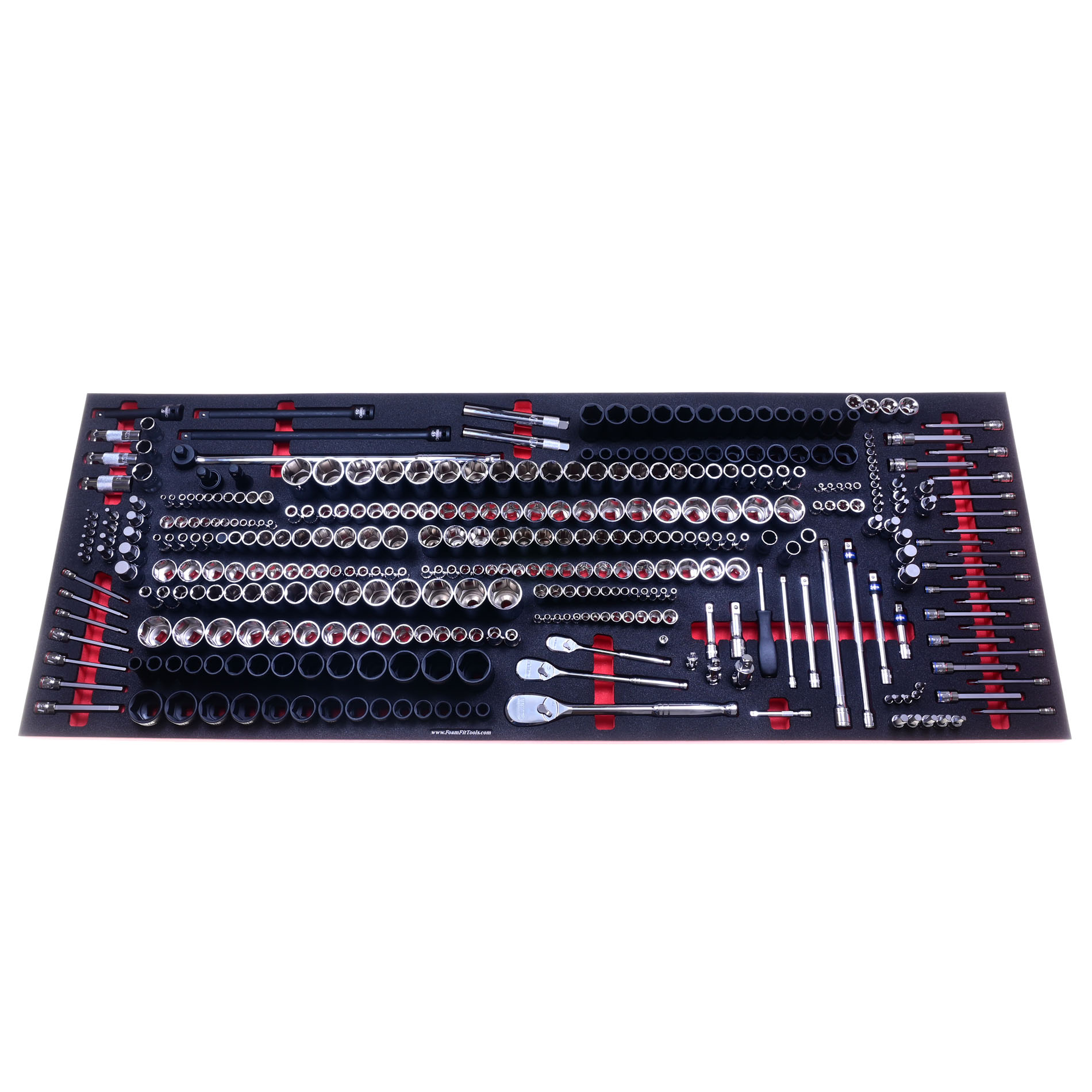 This tool organizer was designed to fit six Quinn socket sets. The chrome 6-point sets include the 1/4-drive set (70261) with 54 pieces, the 3/8-drive set (70317) with 72 pieces, and the 1/2-drive set (70253) with 83 pieces. The impact sockets are from the 1/2-drive set (58680) with 61 pieces. The hex and torx bit sockets are from the 87-piece set (70347), and the spark plug sockets are from the 14-pc set (70168). The ratchets are the longer 90-tooth ratchets. This organizer fits the top drawer of the 56-inch or 72-inch US General Series 3 roll cab. The foam can be trimmed, but measure your toolbox carefully and compare to the minimum trim down size.