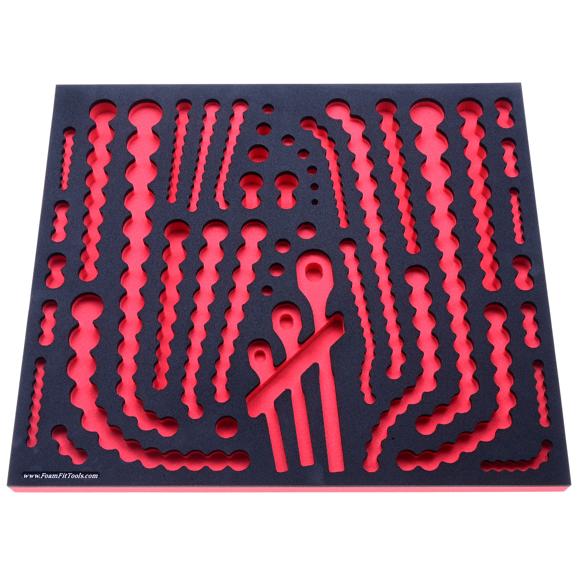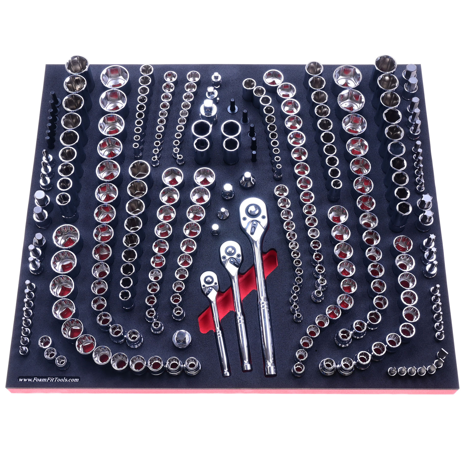 This tool organizer was designed to fit the sockets and ratchets from the Quinn 428-pc set 58154. It is sized for a drawer found in the US General 27-inch and 42-inch Series 3 toolboxes. We removed the breaker bars and extensions to fit all the sockets in a foam this size.