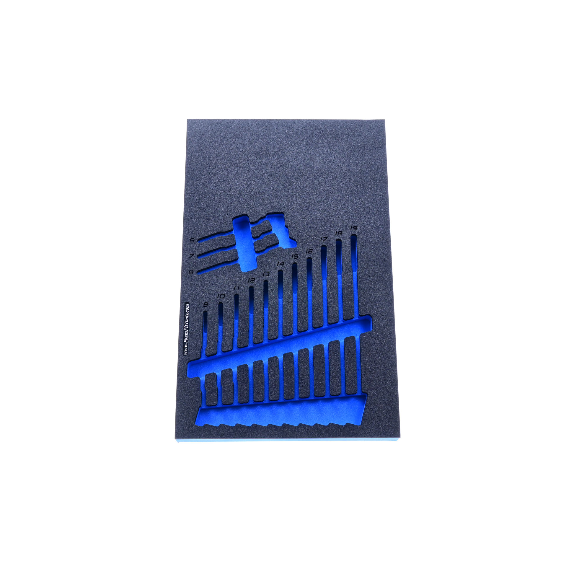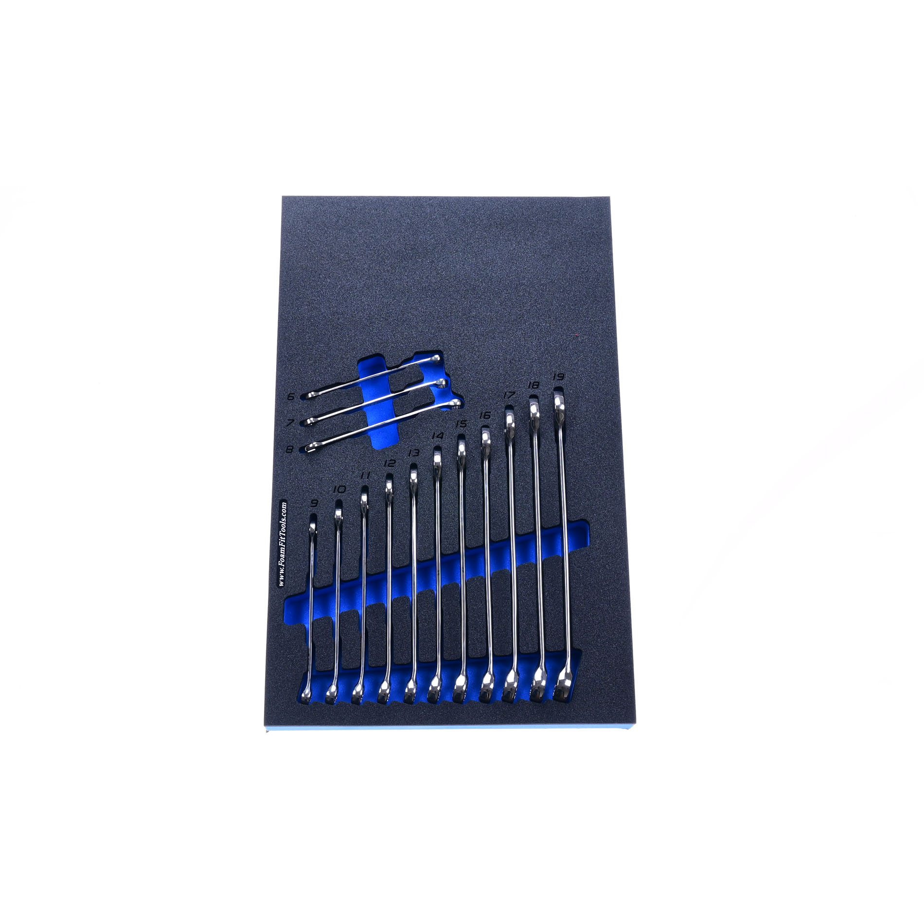When we originally designed our Icon combination wrench organizers, we made one to fit 19 metric sizes (L-05860-T). We didn't make one to fit just the 14-pc set, but we've had several requests so this new layout fits set WCM-14 (64709) or the anti-slip set WCAM-14 (64712). The foam was designed for narrow drawers found in many US General Series 3 tool boxes, but it can be trimmed smaller if needed. The wrench sizes are laser marked on the foam.