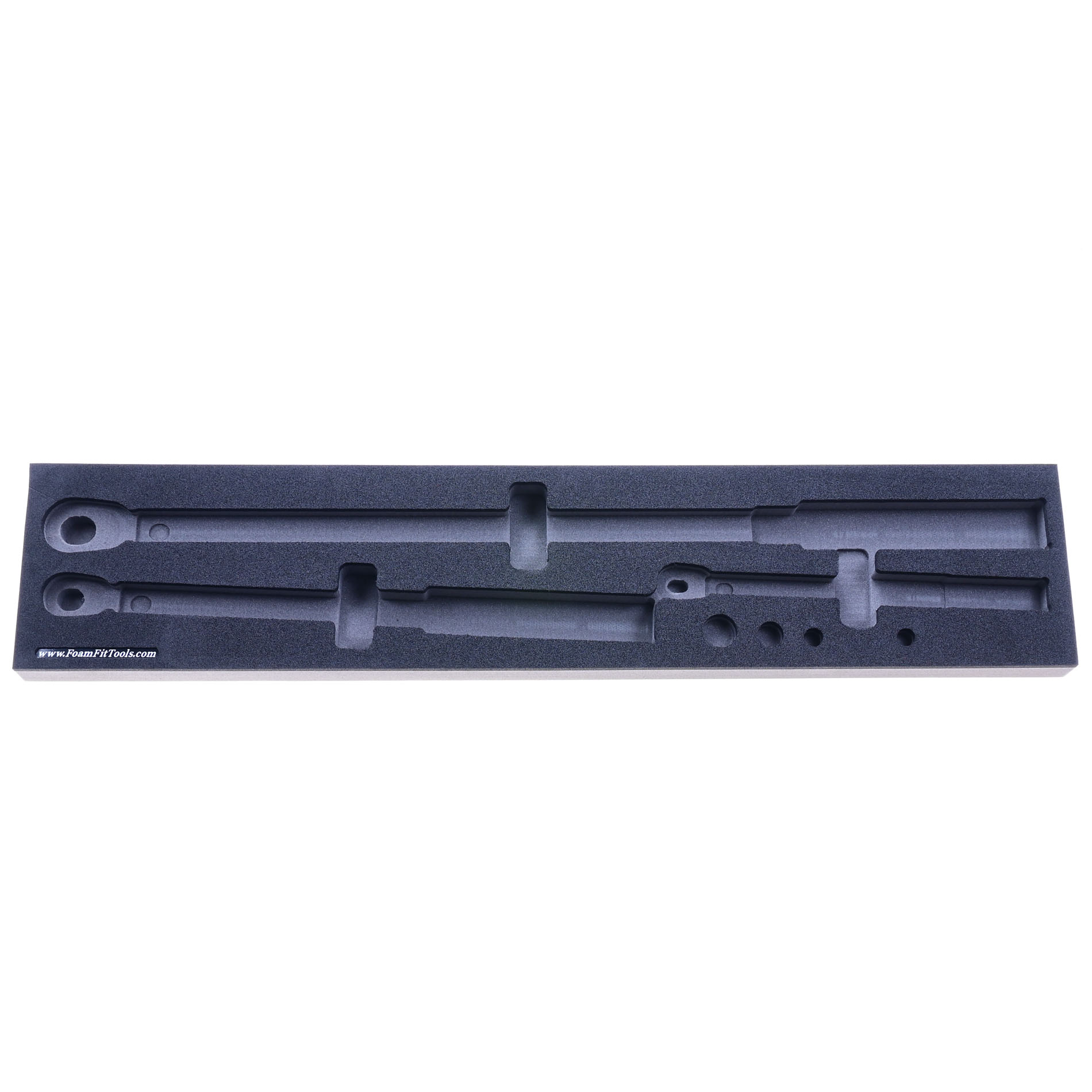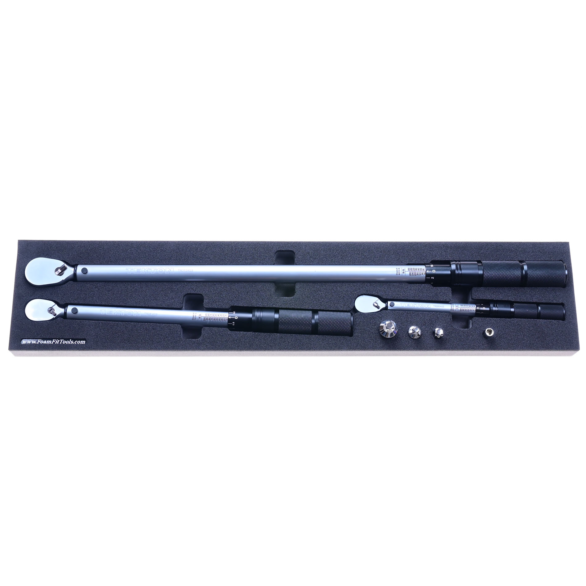 We have included large finger pockets at the balance point to make our foam faster than keeping torque wrenches in cases. This layout also saves a little space in the drawer. Tekton changed their micrometer-style torque wrenches in late 2025, updating to a 90-tooth head and a sliding collar which holds the setting better than the old lock knob. This layout fits the longer 1/2-drive torque wrench (40 to 300 ft-lbs) plus the 3/8-drive and 1/4-drive sizes. These three wrenches are sold as set TRQ95902. The foam also includes spots for the small adpaters that come with the torque wrenches.